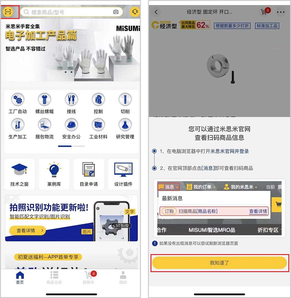 1.打開手機APP,點擊APP首頁掃描功能掃描目錄內(nèi)產(chǎn)品頁的二維碼。