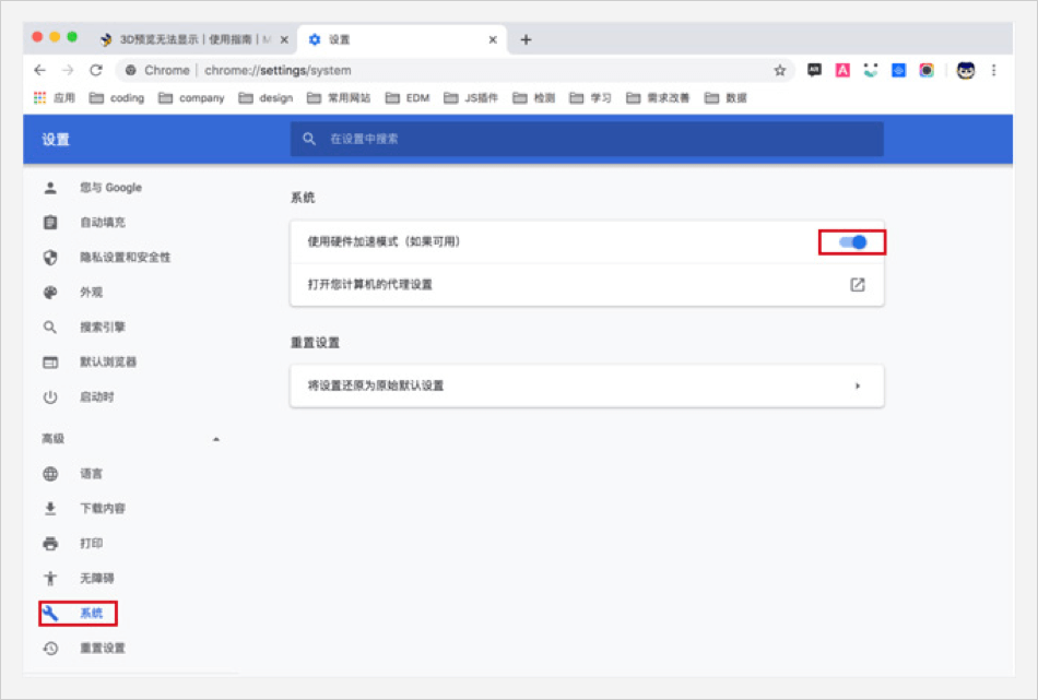 在【高級】選項中,找到【系統(tǒng)】設置,選中【使用硬件加速模式】,設置完成后,重啟瀏覽器生效。