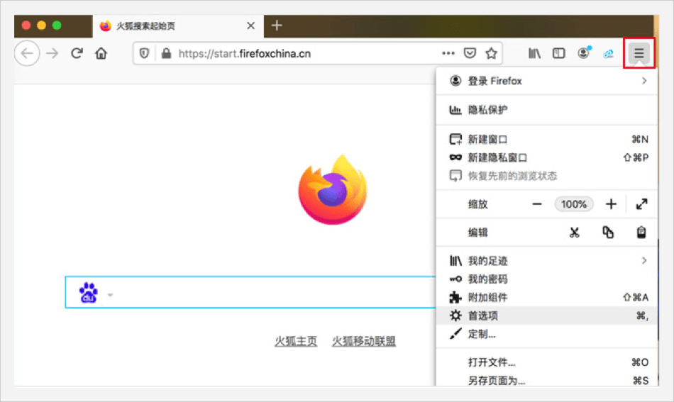 打開Firefox 瀏覽器,選中菜單中的【選項】或【首選項】。
