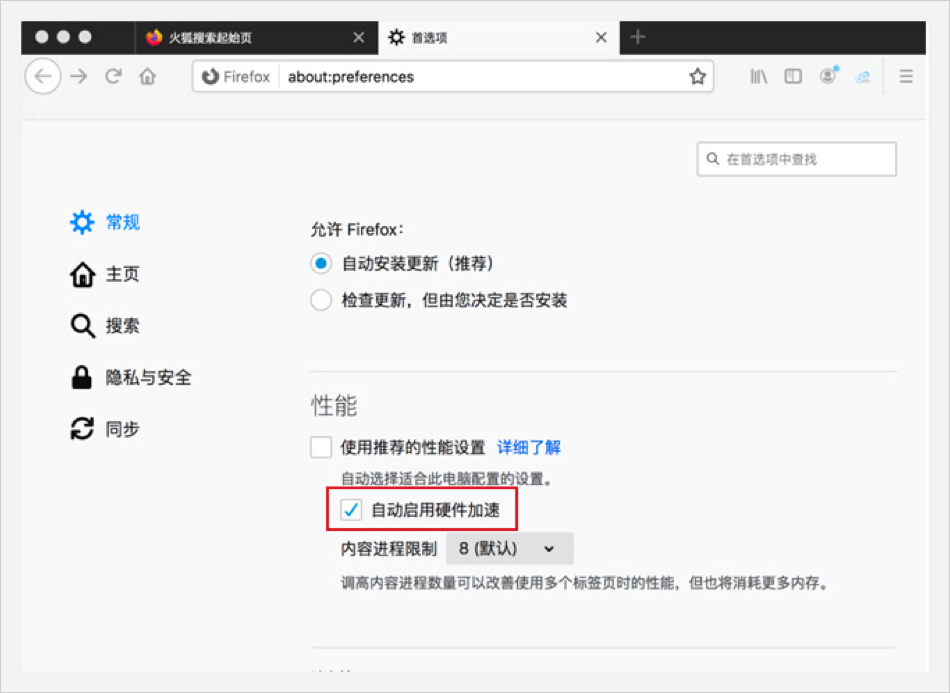 在【常規(guī)】中找到【性能】,選擇“自動啟用硬件加速”。