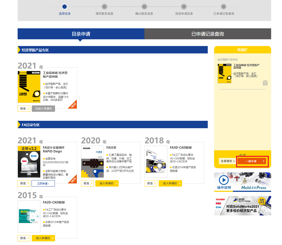 2.選擇需要的產(chǎn)品目錄,點(diǎn)擊【加入申請(qǐng)欄】。