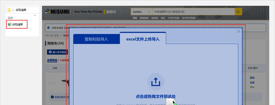 入口一:登錄米思米賬號,在【購物車】頁面,點擊【批量下單/詢價】按鈕,彈出【批量下單/詢價】彈窗。