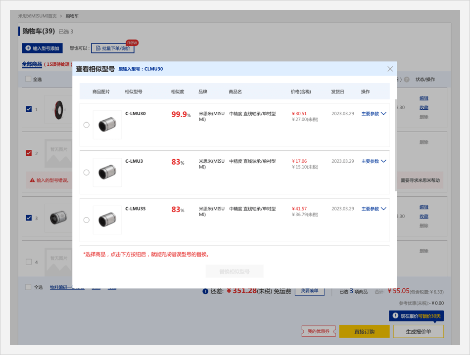 對于沒有找到型號的商品,點擊【查看相似型號】按鈕,推薦相似度高的前三個商品。