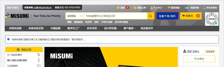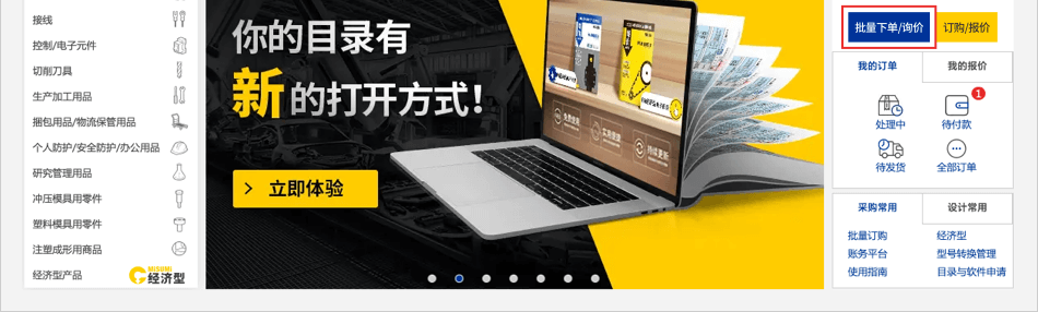 入口二:登錄米思米賬號,點擊首頁【批量下單/詢價】按鈕。