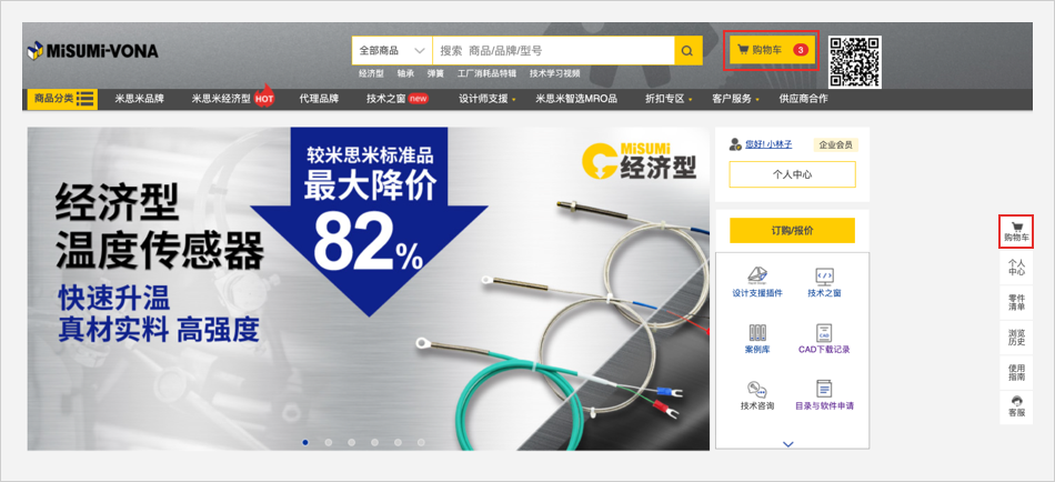 1.無米思米型號:在電子目錄中查找商品,確認(rèn)型號后加入購物車進行報價或訂購。