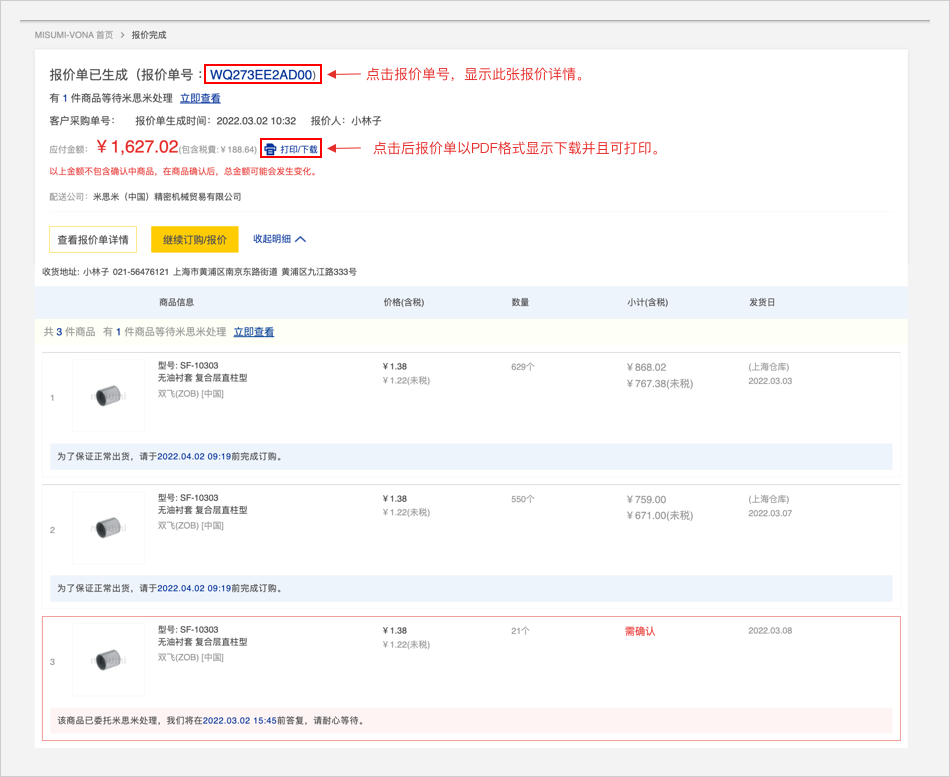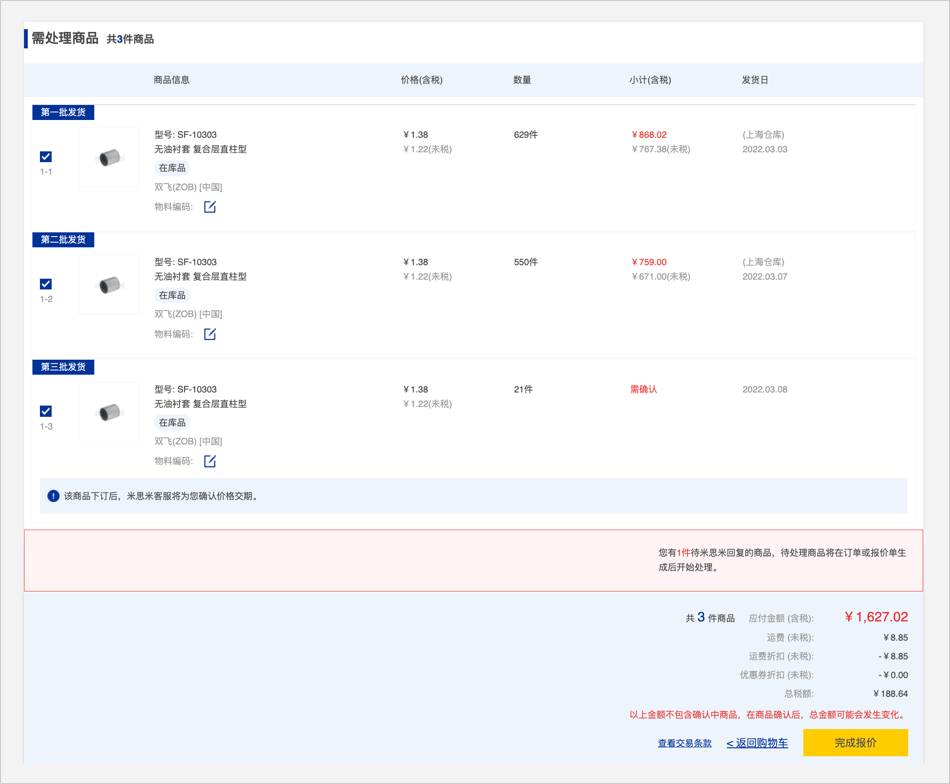 報價單中有需要確認(rèn)的商品時,請按照相應(yīng)的提示信息進行逐個操作。修正完畢,點擊【完成報價】,將更新報價單信息。如未能正確修正時,將再次顯示本頁面。如需米思米幫助解決,請勾選【如需米思米幫您解決,請勾選后提交。】,并點擊【完成報價】繼續(xù)提交。
