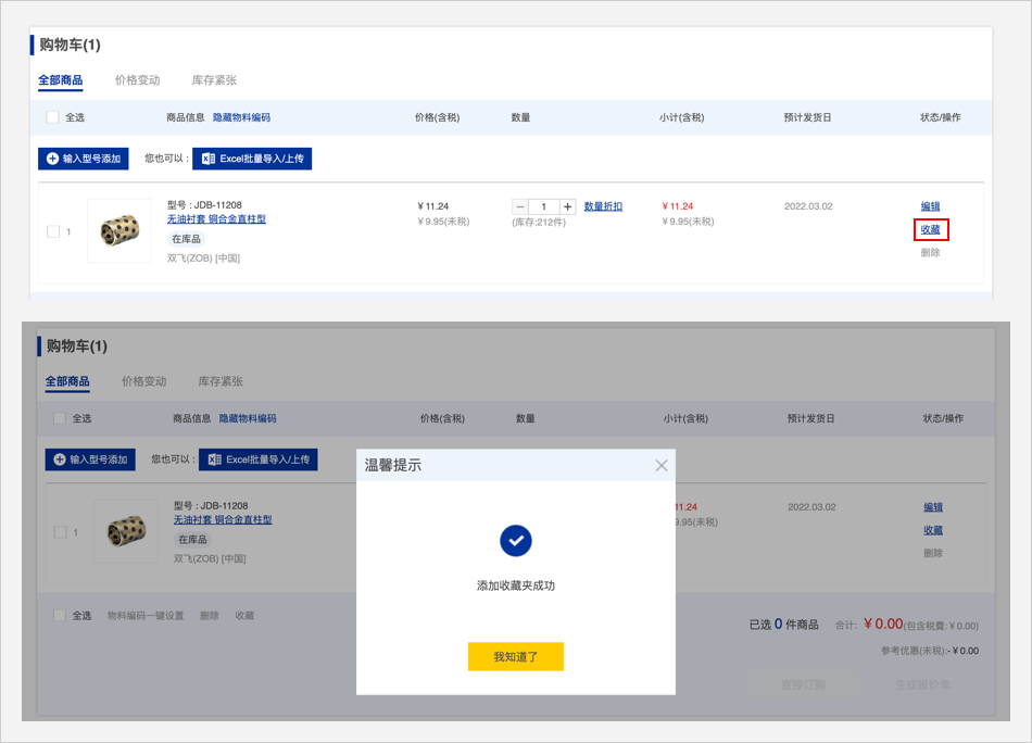 您可將經(jīng)常使用的商品添加到我的收藏夾,下次報價或訂購時,在零件表中就能查到這些型號。