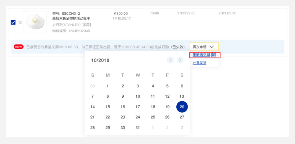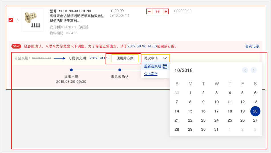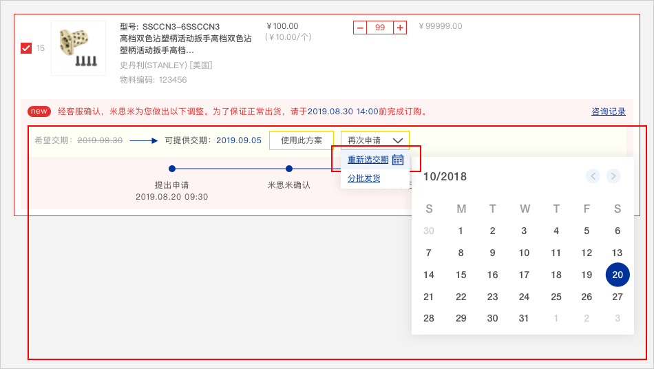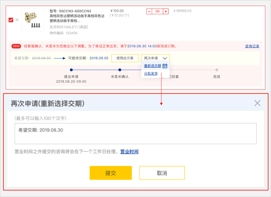 可根據(jù)米思米提供的新交期【使用此方案】或【再次申請】,如果選擇【再次申請】下拉內(nèi)容,選擇【重新選交期】可選擇指定交期時間,報價單確認付款后米思米收到訂單,將會在工作日時間為您處理訂單;