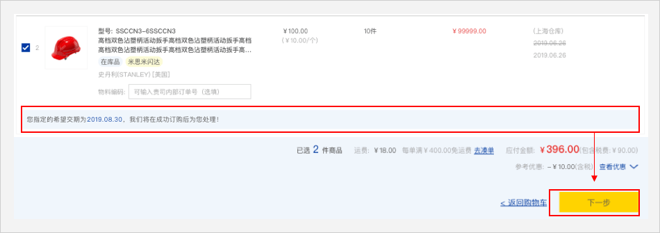 頁面跳轉(zhuǎn)到訂單確認頁,新的交期已確定。米思米將在您訂購成功后為您處理。點擊【下一步】進入訂購確認頁面。