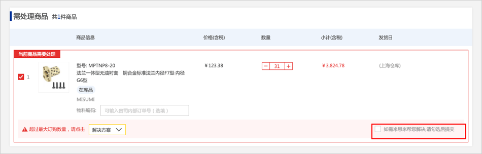 在報價單確認頁面中,商品數(shù)量超過最大訂購數(shù)量,您可以【如需米思米幫您解決,請勾選后提交】,勾選后點擊【去結(jié)算】,跳出彈窗。