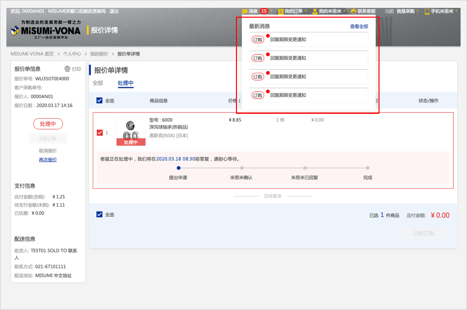 可根據(jù)米思米提供的新交期【使用此方案】或【再次申請】,如果選擇【使用此方案】unfit商品處理完成,頁面自動跳轉(zhuǎn)到報價單確認頁面。