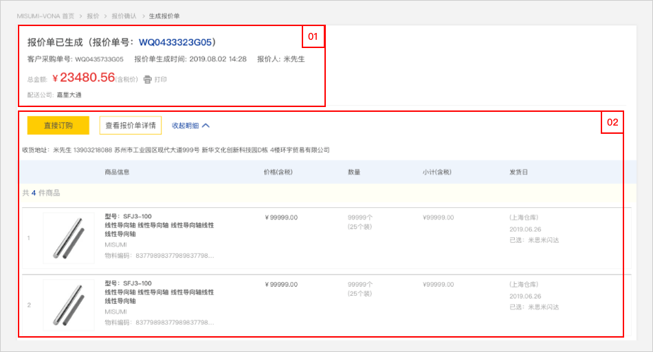 1.報價單已生成:可通過報價單號查看報價單詳情;確認客戶采購單號、報價單生成時間、訂購人、應(yīng)付金額、配送公司信息等,也可打印此訂單。