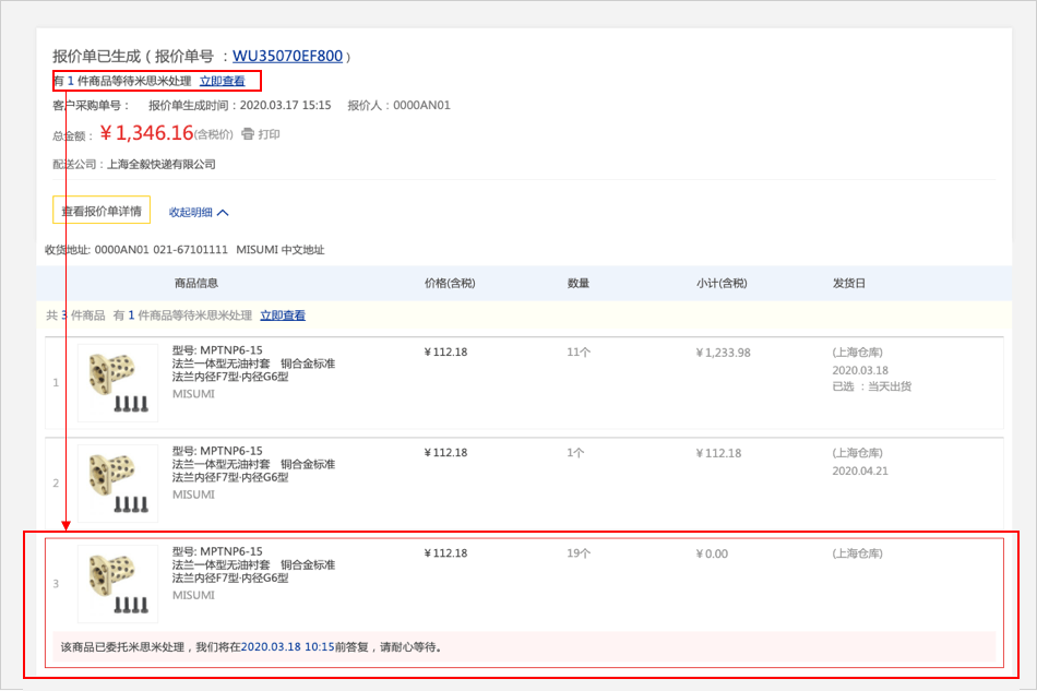 有1件商品等待米思米處理,我們將在2020.03.18.10.15前答復(fù),請耐心等待,可點擊【立即查看】頁面跳轉(zhuǎn)到商品詳情。