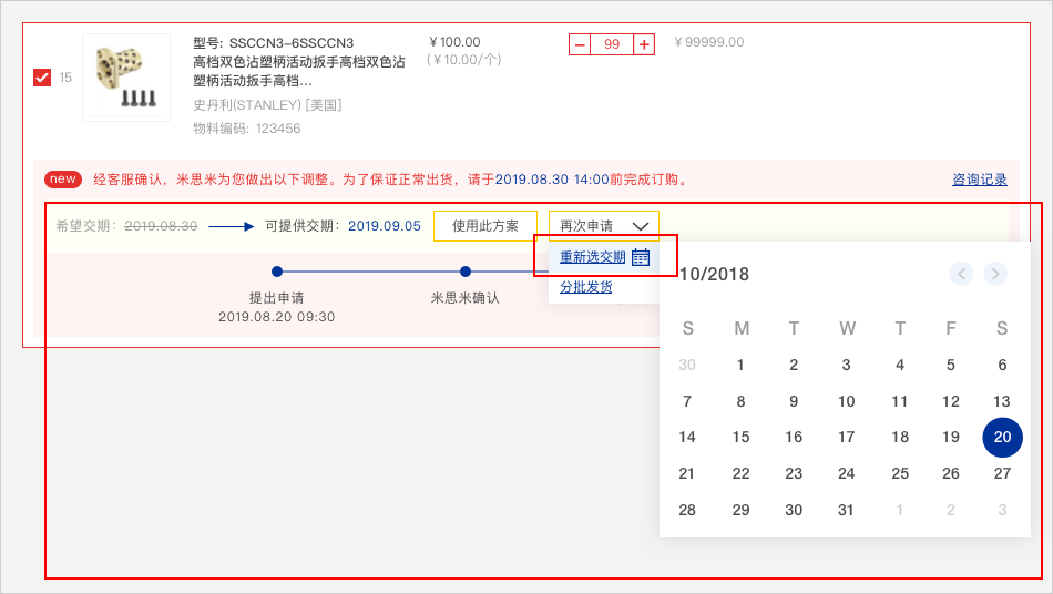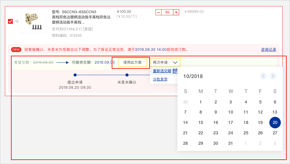 可根據(jù)米思米提供的新交期【使用此方案】或【再次申請】,如果選擇【再次申請】下拉內(nèi)容,選擇【重新選交期】可選擇指定交期時間,訂單確認(rèn)付款后米思米收到訂單,將會在工作日時間為您處理訂單;