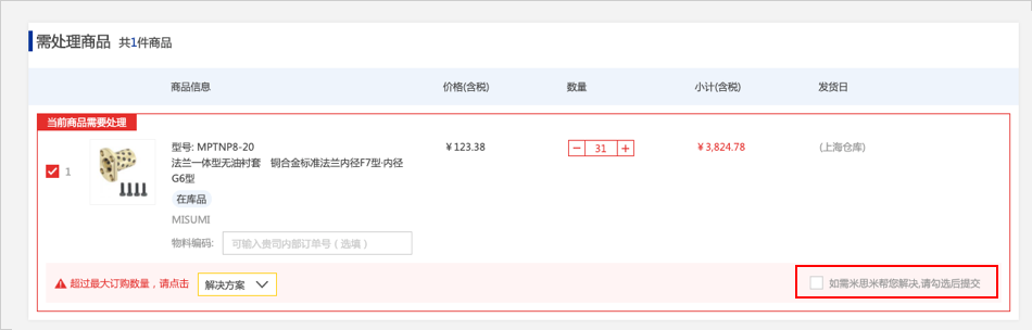 在訂單確認(rèn)頁面中,商品數(shù)量超過最大訂購數(shù)量,您可以勾選【如需米思米幫您解決,請勾選后提交】后,點擊【去結(jié)算】,跳出彈窗。