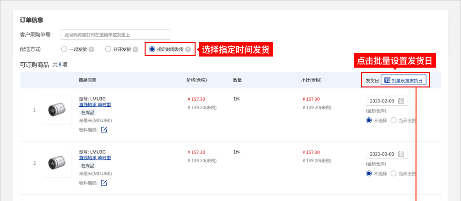 点击“日期下方的空白方格”,可一键选择该日期下的全部商品的发货日(该日期下灰色不可选的商品除外)。