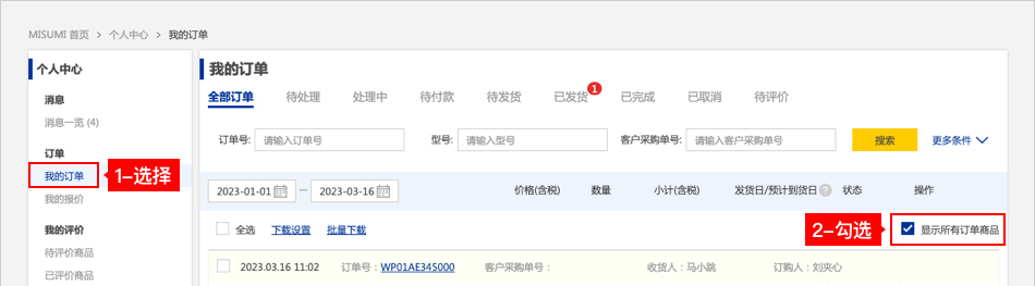 方法一:在【我的報(bào)價(jià)】頁(yè)面,勾選【顯示所有訂單商品】即可查看預(yù)計(jì)到貨日。