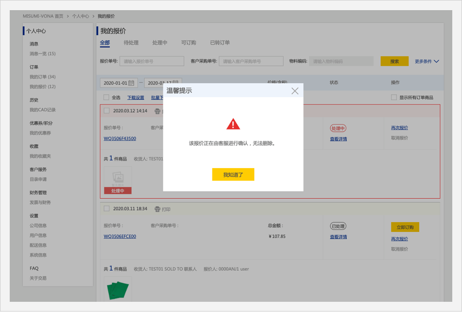 在报价详情页面,【处理中】的商品,点击【如何取消報(bào)價(jià)單】,侧边栏出现错误红色文字提示。