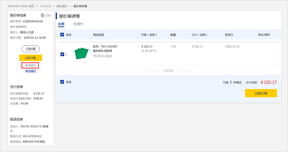 在报价历史页面,【已处理】的商品,点击【如何取消報(bào)價(jià)單】,报价立即被删除。