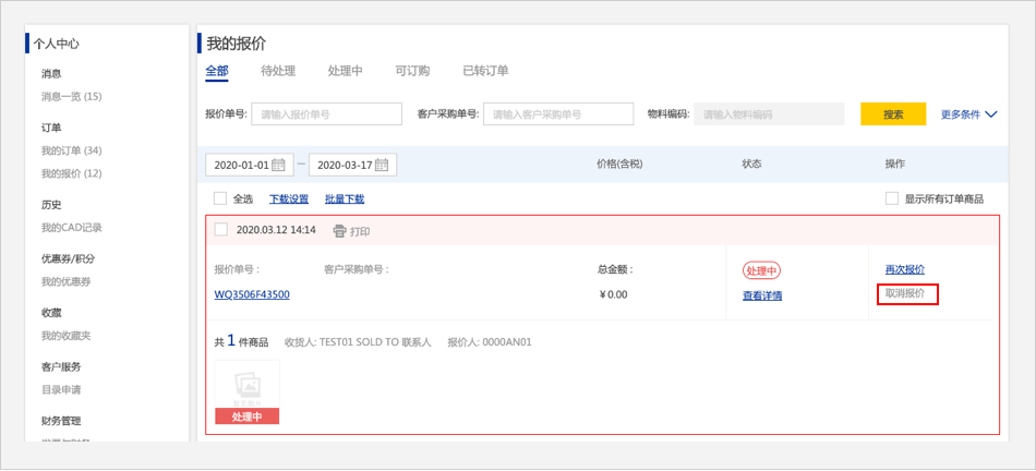 在报价详情页面,【已处理】的商品,点击【如何取消報(bào)價(jià)單】,页面跳转到报价历史页面再次点击【如何取消報(bào)價(jià)單】该报价则被删除。
