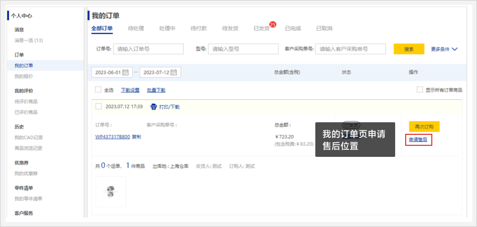 入口一:在【我的訂單】頁面,點擊【申請售后】即可進(jìn)入到售后頁面。