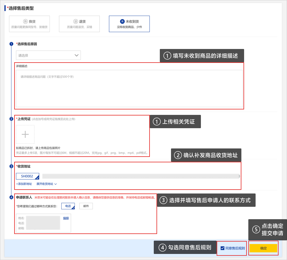 址。③確認(rèn)售后申請聯(lián)系人信息。④勾選【同意售后規(guī)則】。⑤點擊【確定】按鈕