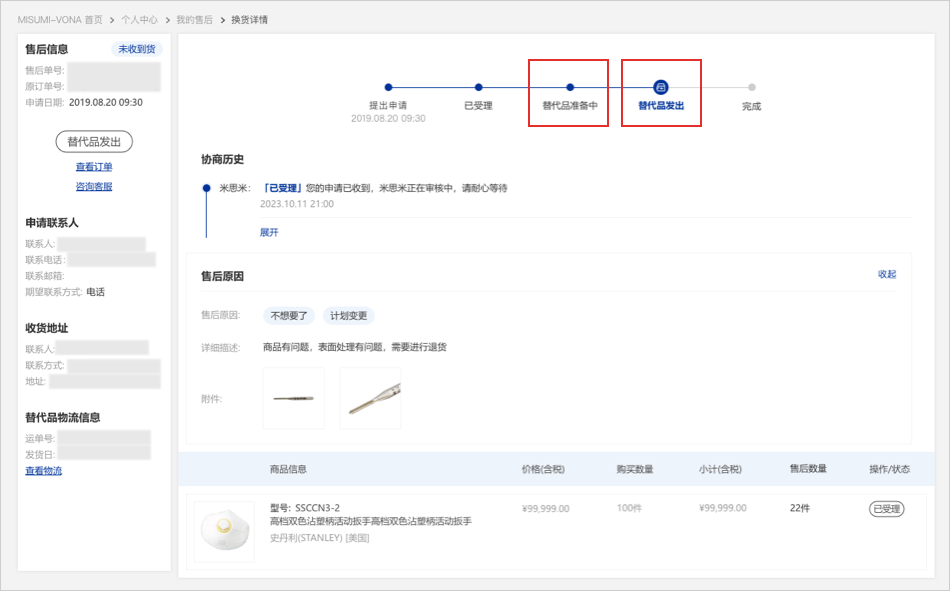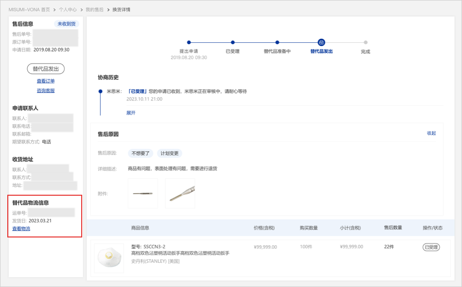 未收到貨申請通過后,米思米將會寄出替代品,您可以在此流程下查看替代品物流單號以及預(yù)計發(fā)貨日。替代品發(fā)出后,您可以查看替代品物流信息。
