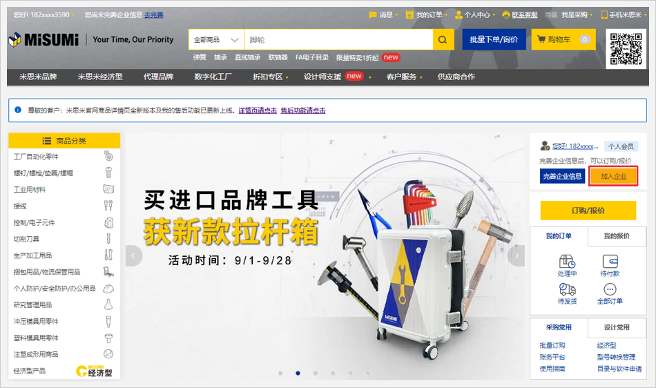 1、完善企業(yè)信息:注冊(cè)成為米思米個(gè)人會(huì)員后,直接在完成注冊(cè)的頁(yè)面點(diǎn)擊【加入企業(yè)】?;蛘咴谑醉?yè)選擇【加入企業(yè)】。