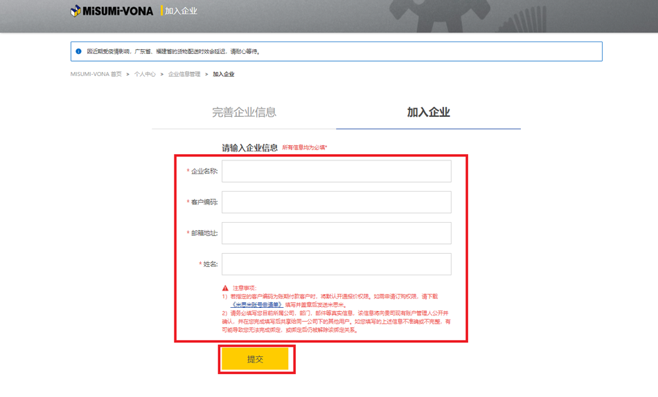 加入現(xiàn)有企業(yè):您的企業(yè)已在米思米注冊(cè)成為企業(yè)用戶(即已有客戶編碼),請(qǐng)選擇該方式。