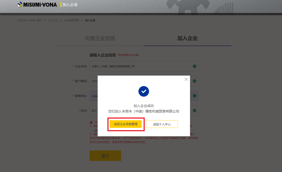 3.加入企業(yè)成功,您已成為企業(yè)用戶,您可點(diǎn)擊【返回企業(yè)信息管理】查看企業(yè)詳情。