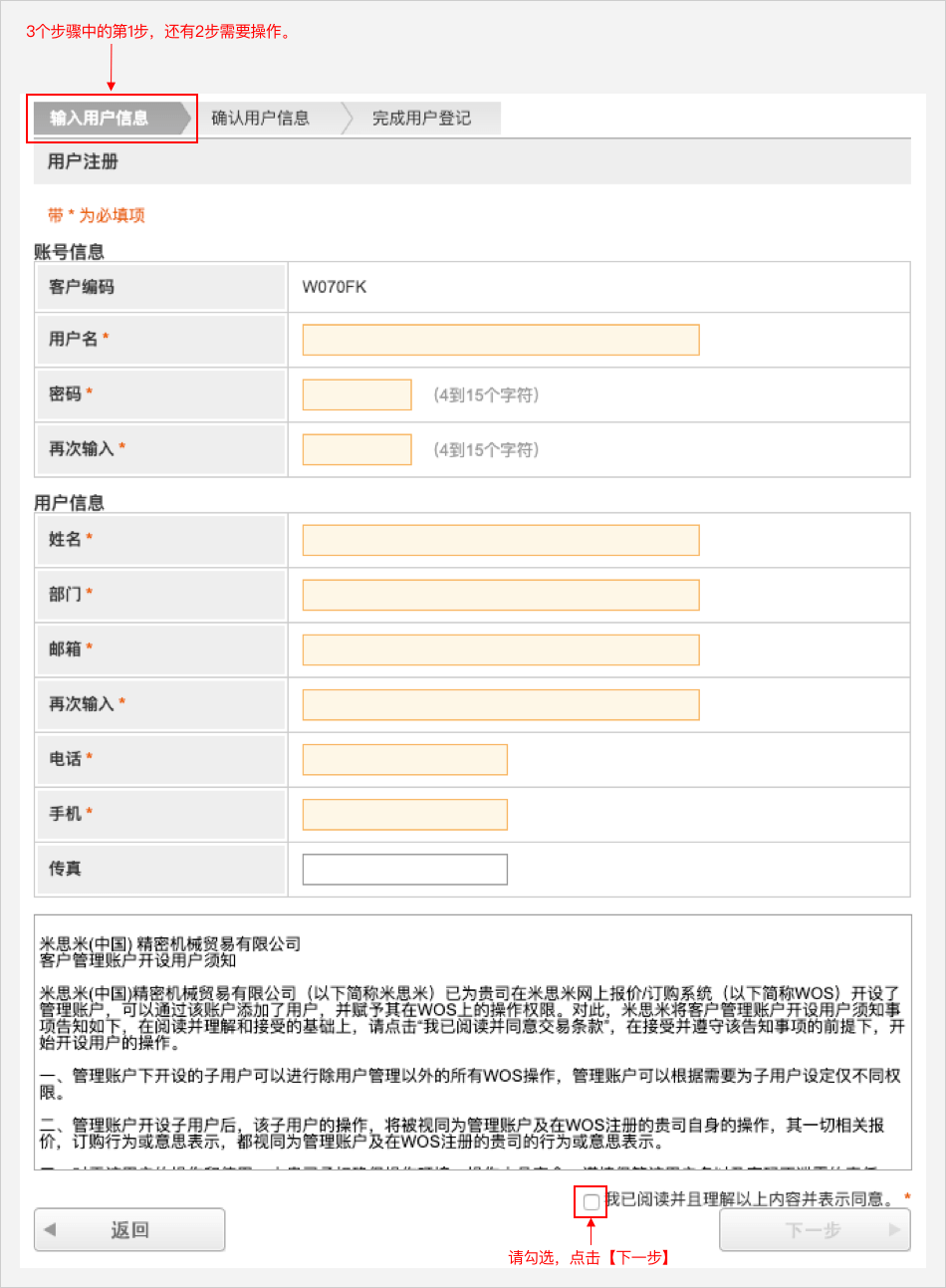 请输入必填项,并勾选"我已经阅读并同意交易条款",点击【下一步】。
