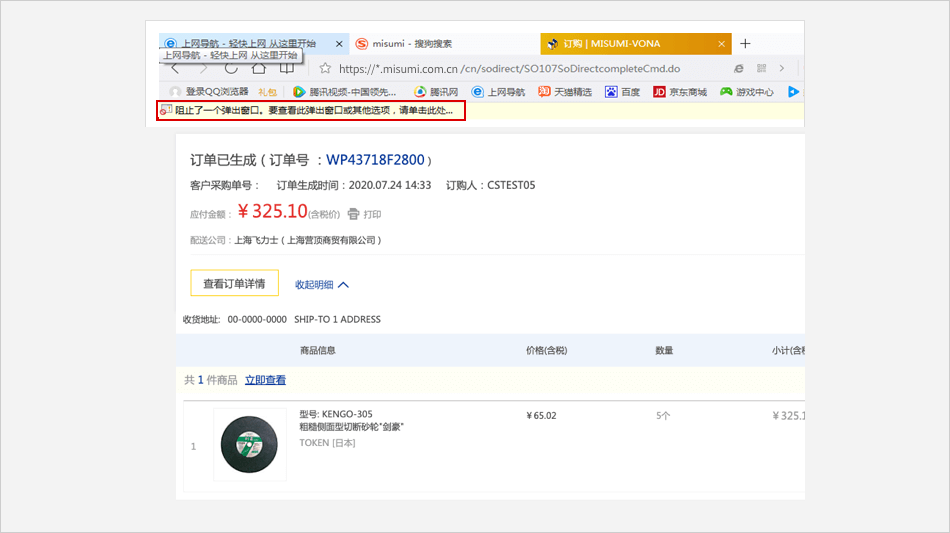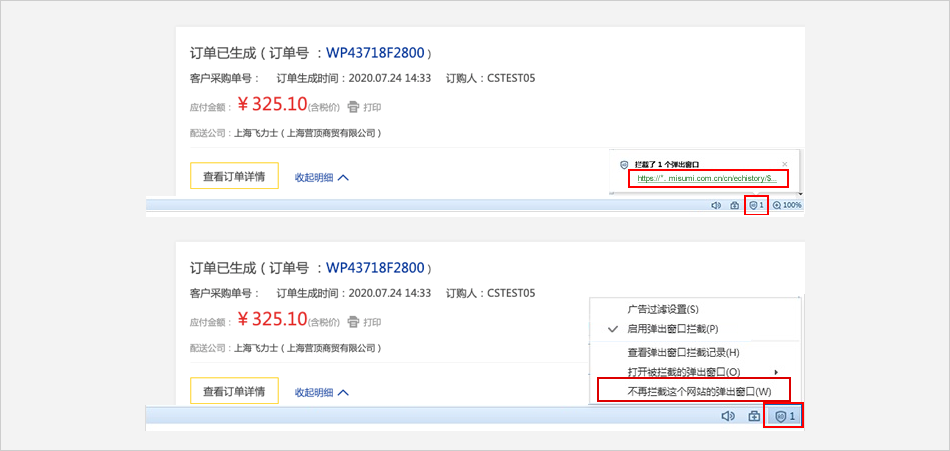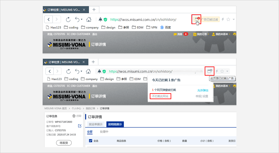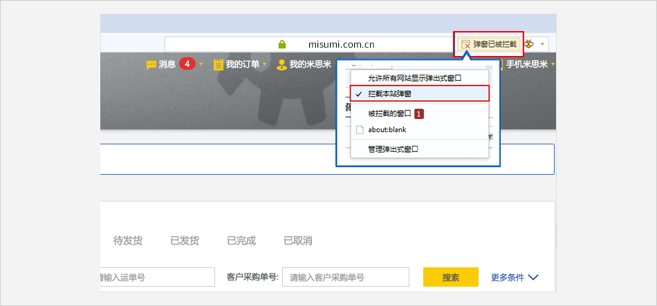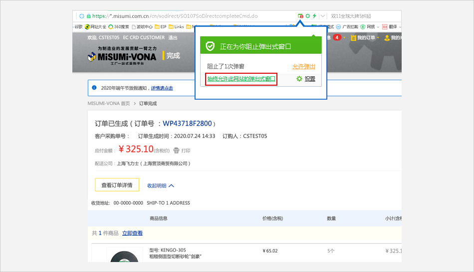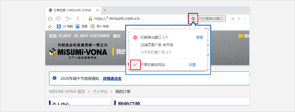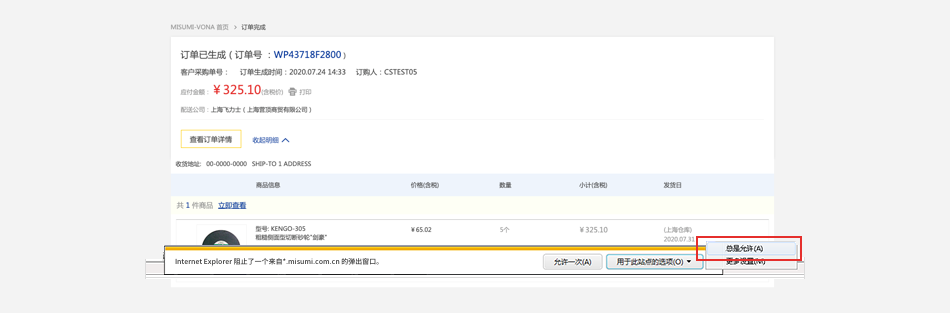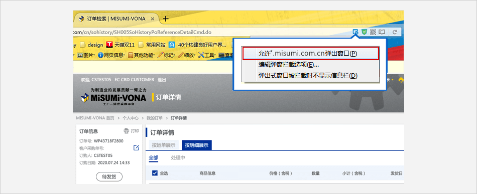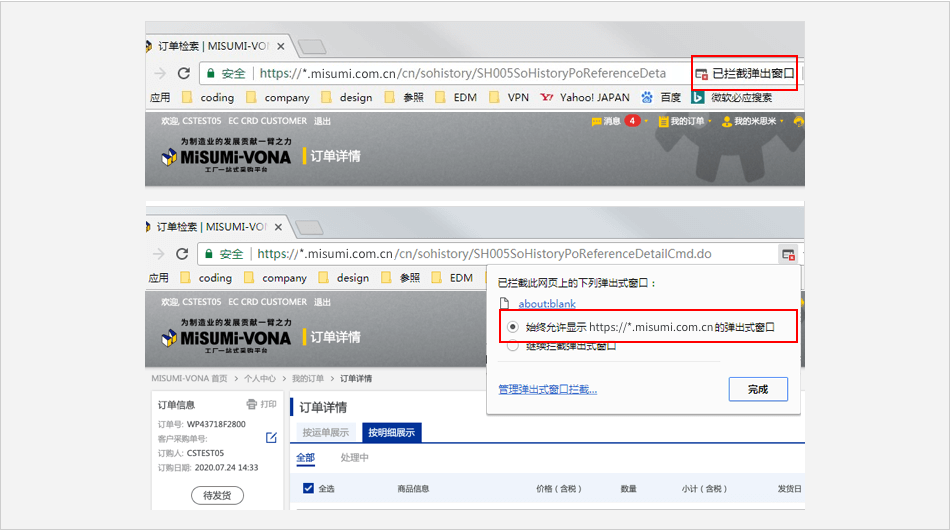 單擊瀏覽器地址欄框中的攔截標(biāo)志 ? 點(diǎn)擊 【始終允許顯示 https://*.misumi.com.cn 的彈出式窗口】 。