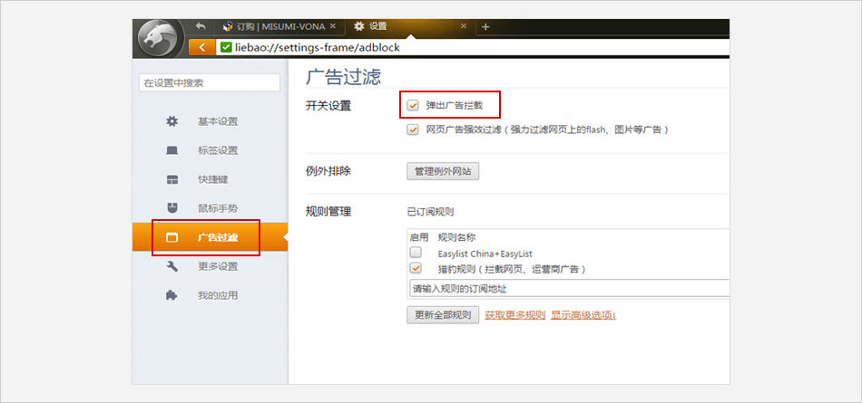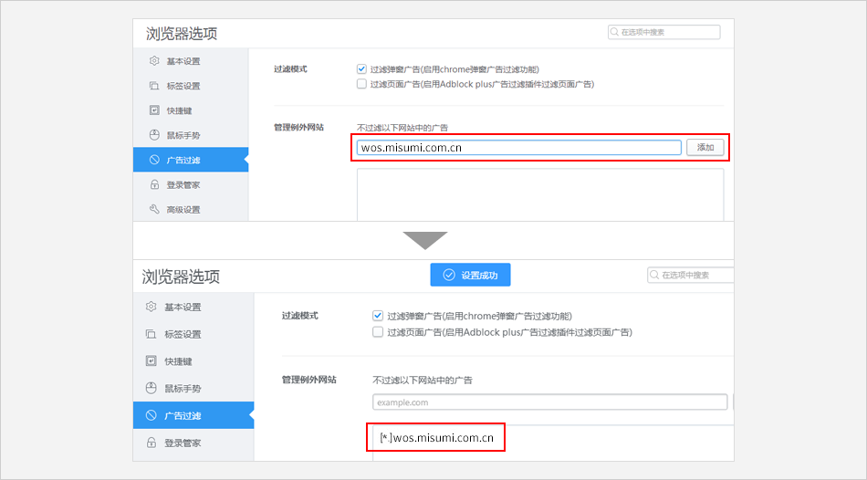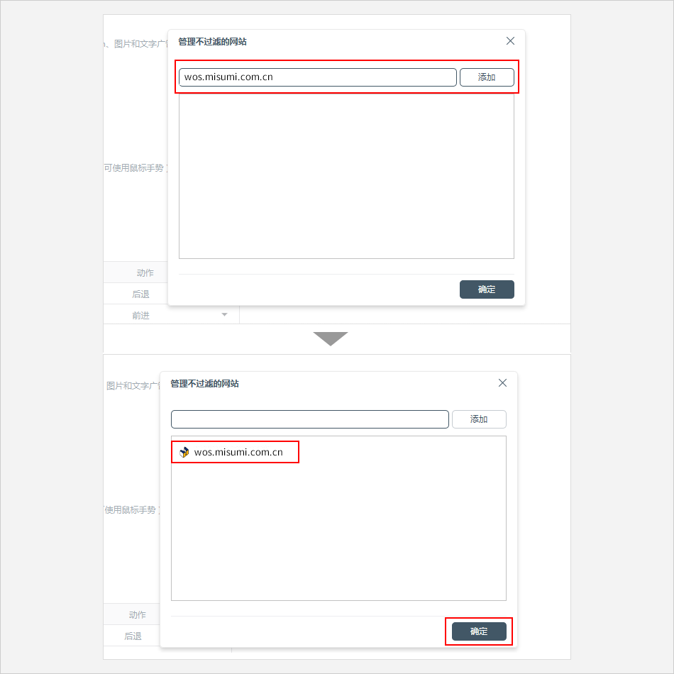 點(diǎn)擊 【廣告過濾】 ? 在右側(cè)的頁面中 【管理例外網(wǎng)站】 的輸入框中輸入米思米網(wǎng)址:www.thinkpadoption.com.cn ? 點(diǎn)擊 【添加】。