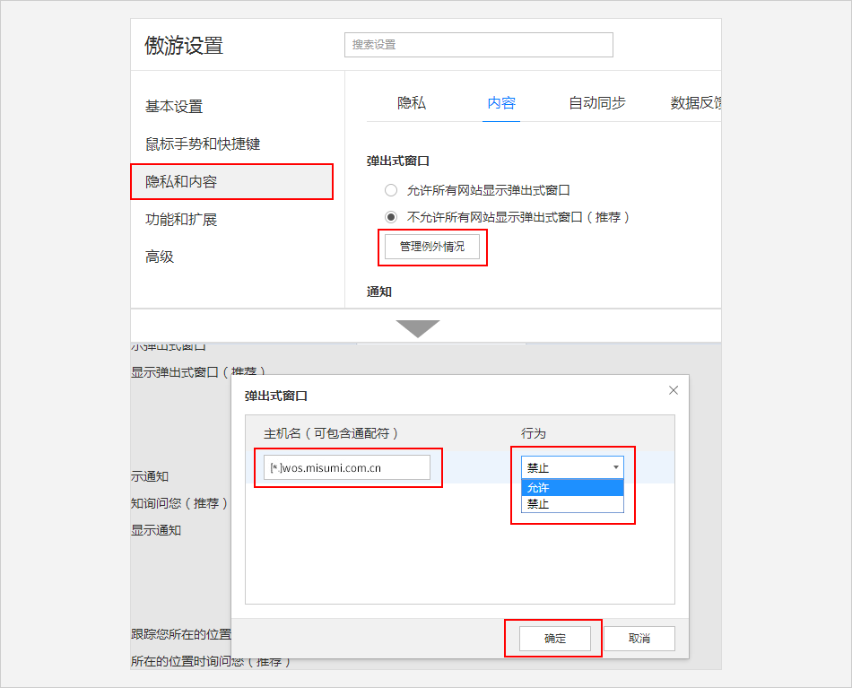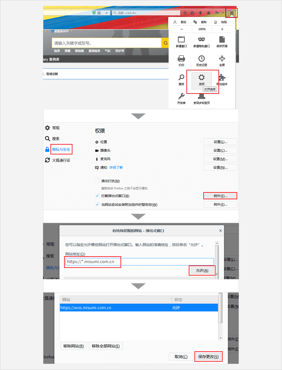 單擊瀏覽器右上角的菜單標(biāo)志 ? 點(diǎn)擊【選項(xiàng)】? 單擊 【隱私與安全】 選項(xiàng) ? 在右側(cè)的 “權(quán)限 ”選項(xiàng)內(nèi)容,點(diǎn)擊 “攔截彈出式窗口” 右側(cè)的【例外】 按鈕 ? 在網(wǎng)址地址欄中輸入米思米網(wǎng)址:https://*.misumi.com.cn? 點(diǎn)擊 【允許】? 最后點(diǎn)擊【保存更改】。
