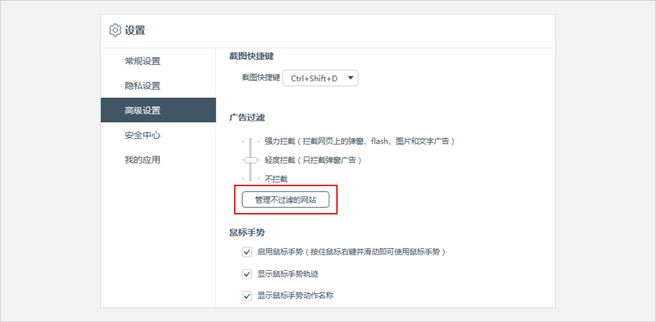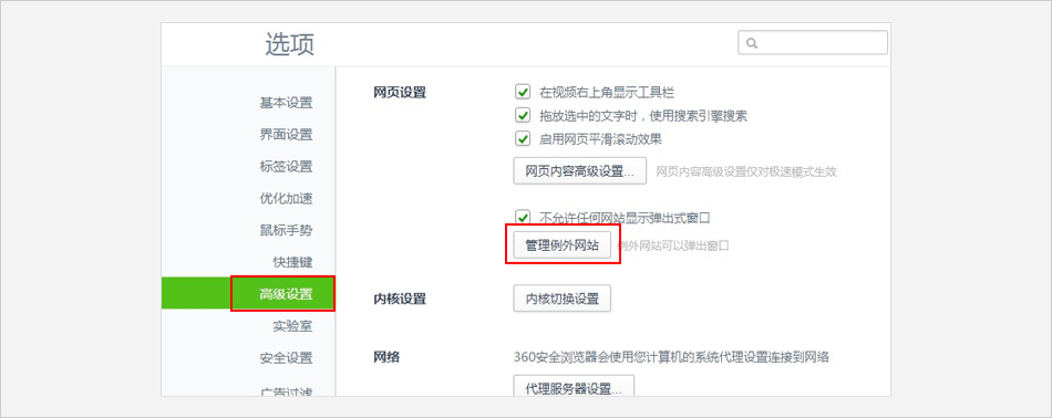 在左側(cè)列表中 ? 點(diǎn)擊【高級(jí)設(shè)置】 ? 再點(diǎn)擊【管理例外網(wǎng)站】。