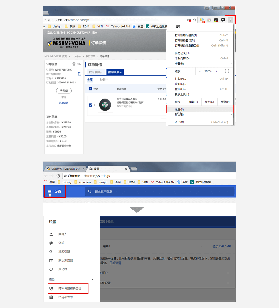 點(diǎn)擊右上角的菜單標(biāo)志 ? 選擇 【設(shè)置】 ? 單擊左上角的設(shè)置標(biāo)示? 在下拉框中點(diǎn)擊 【隱私設(shè)置和安全性】。