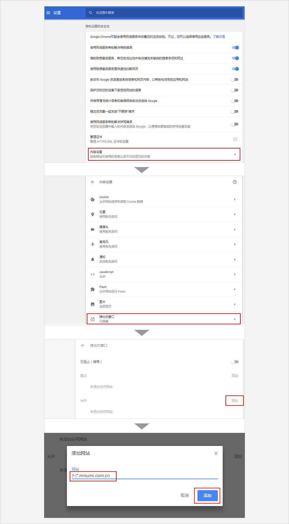 單擊【內(nèi)容設(shè)置】展開頁面 ? 點(diǎn)擊 【彈出式窗口】選項(xiàng)? 點(diǎn)擊【添加】 ? 輸入米思米網(wǎng)址:[*.]www.thinkpadoption.com.cn ?