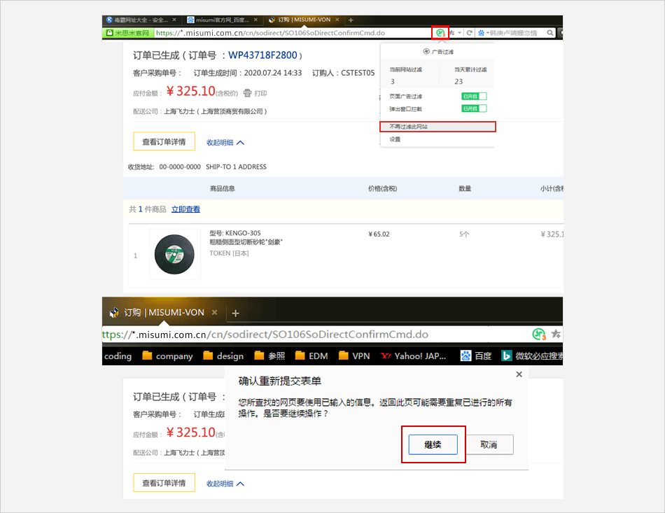 單擊網(wǎng)址欄的攔截標(biāo)志 ? 選擇 【不再過濾此網(wǎng)站】 ? 點(diǎn)擊【繼續(xù)】 ? 顯示付款頁面。