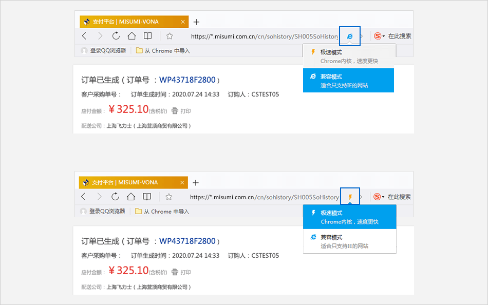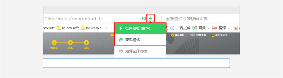 點(diǎn)擊【付款】頁面無反應(yīng) ? 請(qǐng)?jiān)跇O速和IE模式之間切換后再次點(diǎn)擊【付款】按鈕。