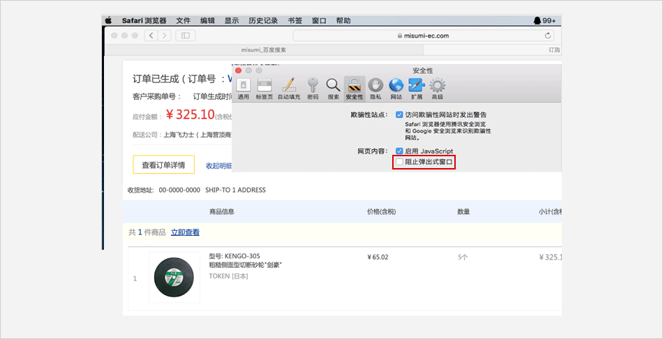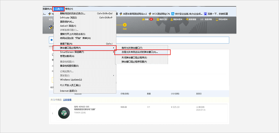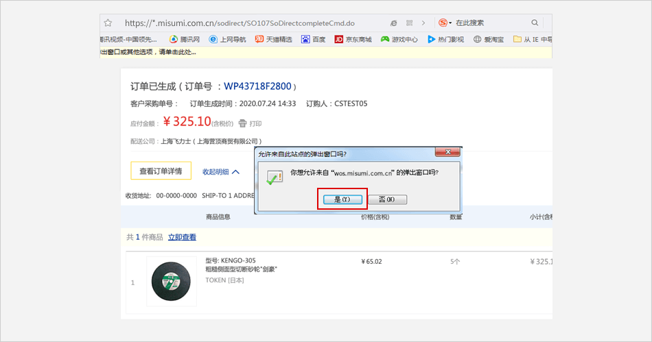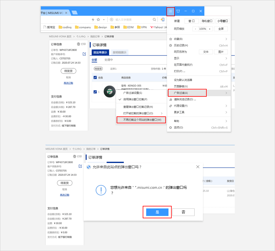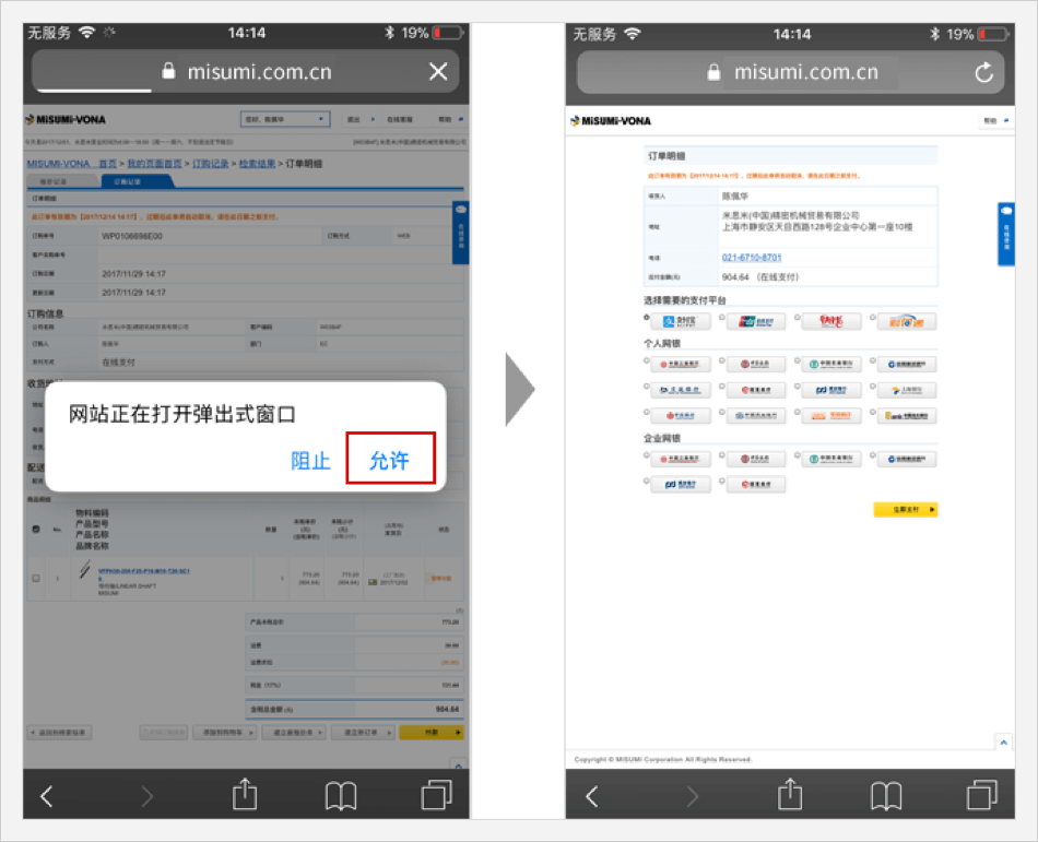 打開瀏覽器進(jìn)行訂購并付款 ? 頁面會(huì)出現(xiàn)彈窗提示 ? 點(diǎn)擊 【允許】 即可進(jìn)行付款。