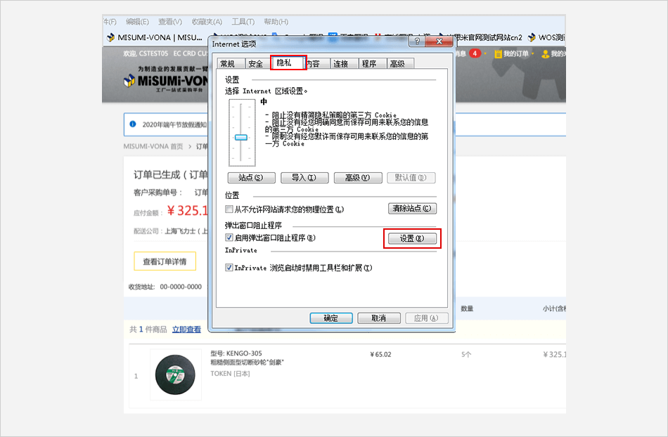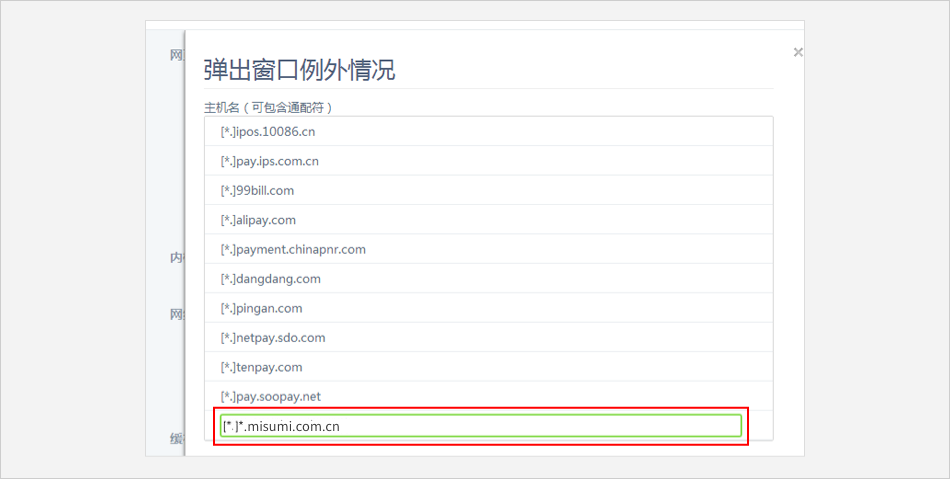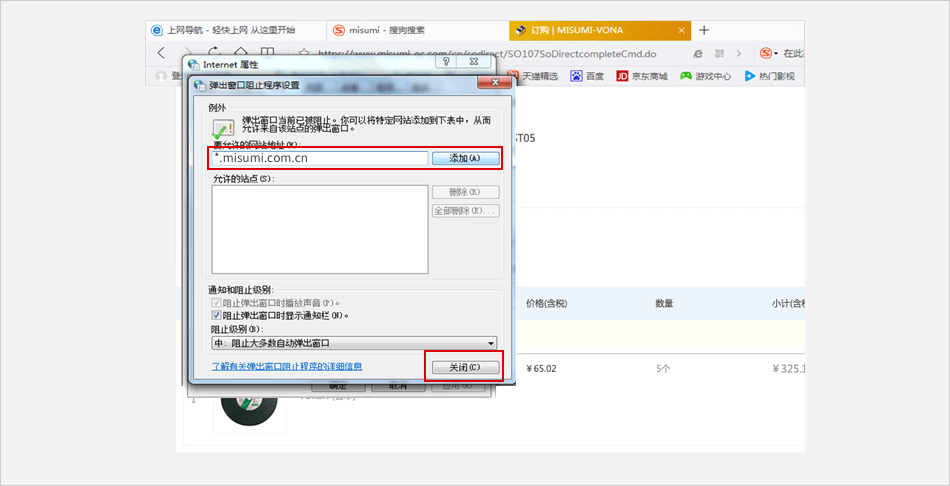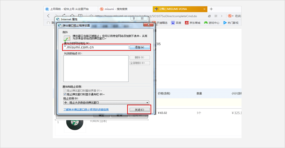 文本框內(nèi)輸入米思米網(wǎng)址:[*.]*.misumi.com.cn ? 關(guān)閉設(shè)置頁面。