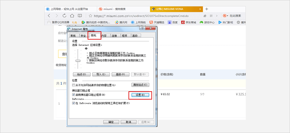 點(diǎn)擊 【隱私和內(nèi)容】 ? 點(diǎn)擊 【管理列外情況】 按鈕? 在彈出窗口頁面中輸入米思米網(wǎng)址:[*.]www.thinkpadoption.com.cn ? 在行為下拉框中選擇