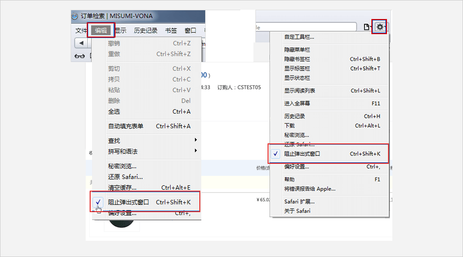 單擊瀏覽器上方的【編輯】? 點(diǎn)擊【阻止彈出式窗口】 ,去除 √ ?;騿螕魹g覽器右上角的設(shè)置標(biāo)志 ? 將 【阻止彈出式窗口】 前的 √ 去掉。