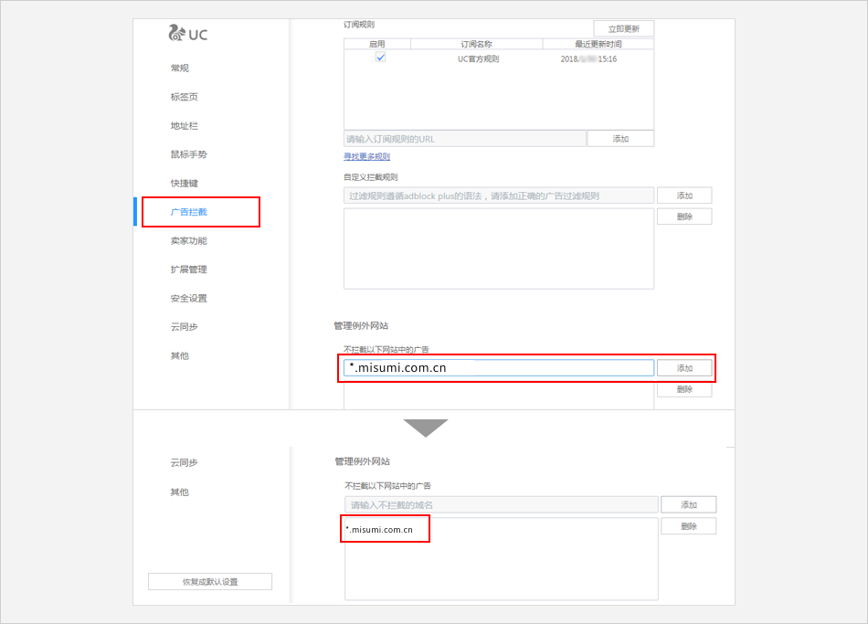 點(diǎn)擊 【廣告攔截】 ? 在右側(cè)的頁面中 【管理例外網(wǎng)站】 下方的輸入框中輸入米思米網(wǎng)址:www.thinkpadoption.com.cn ? 點(diǎn)擊 【添加】。