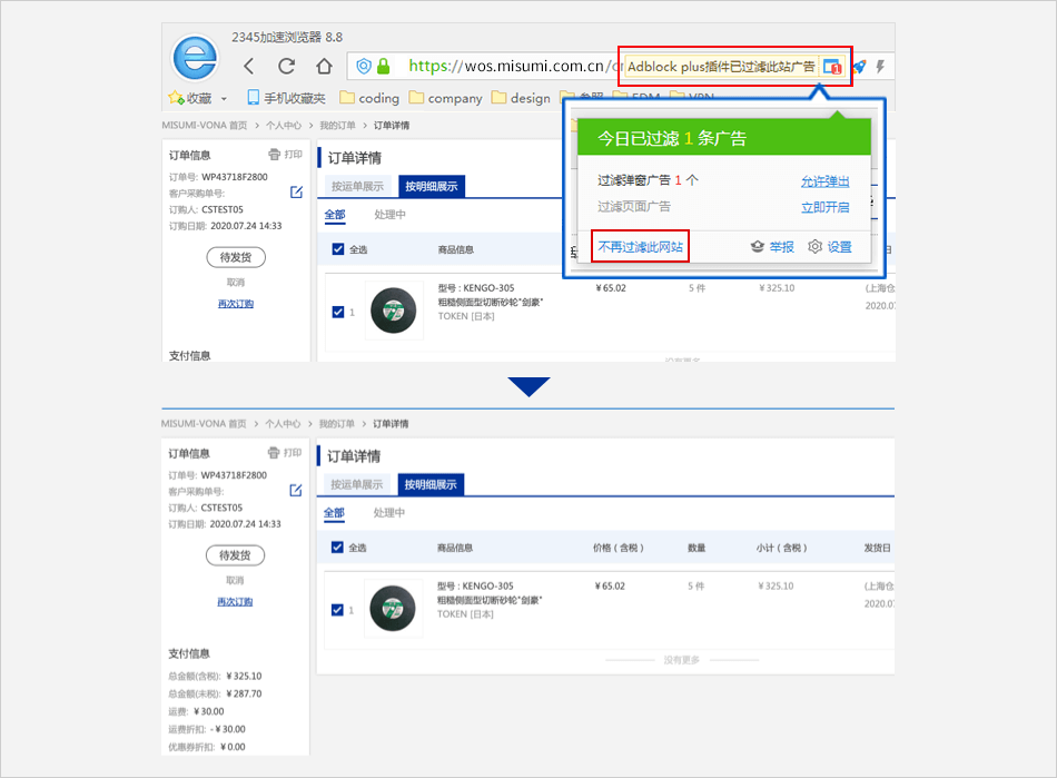 選擇【廣告過濾】? 去除對(duì)【彈出廣告攔截】的勾選? 米思米網(wǎng)站上點(diǎn)擊【付款】進(jìn)行支付。