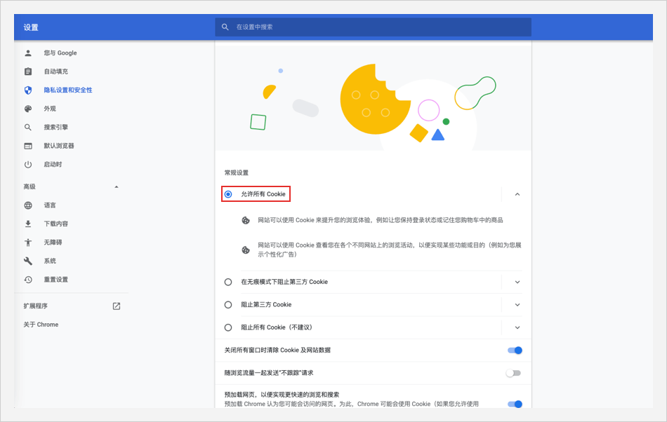 設置——隱私設置和安全性——點選【允許所有cookie】