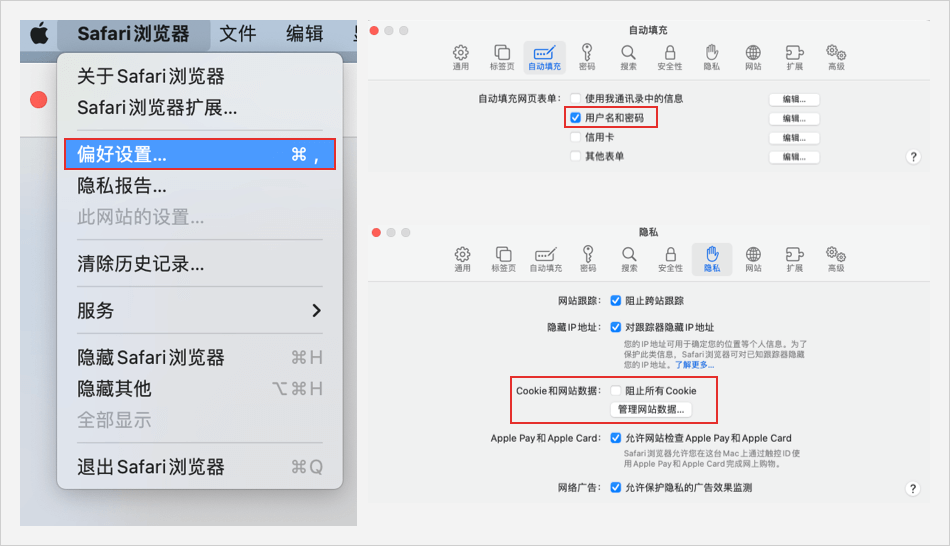 ②偏好設置——隱私——取消勾選【阻止所有cookie】