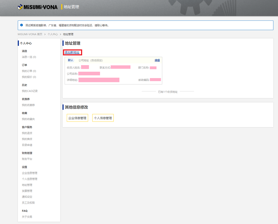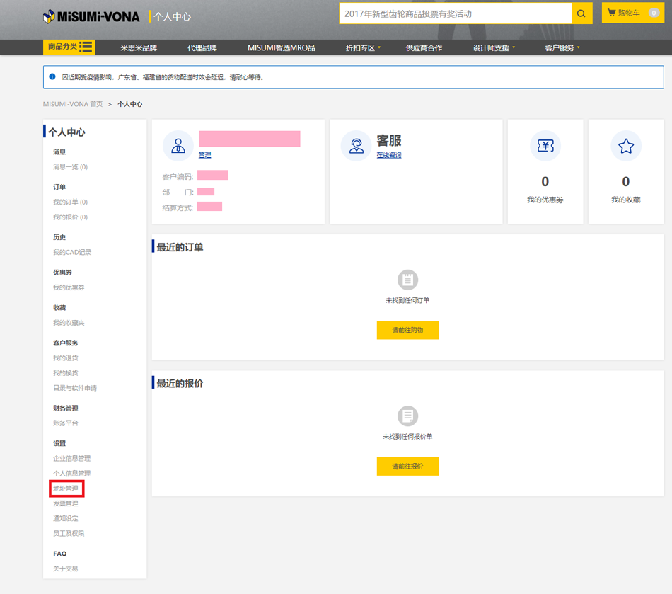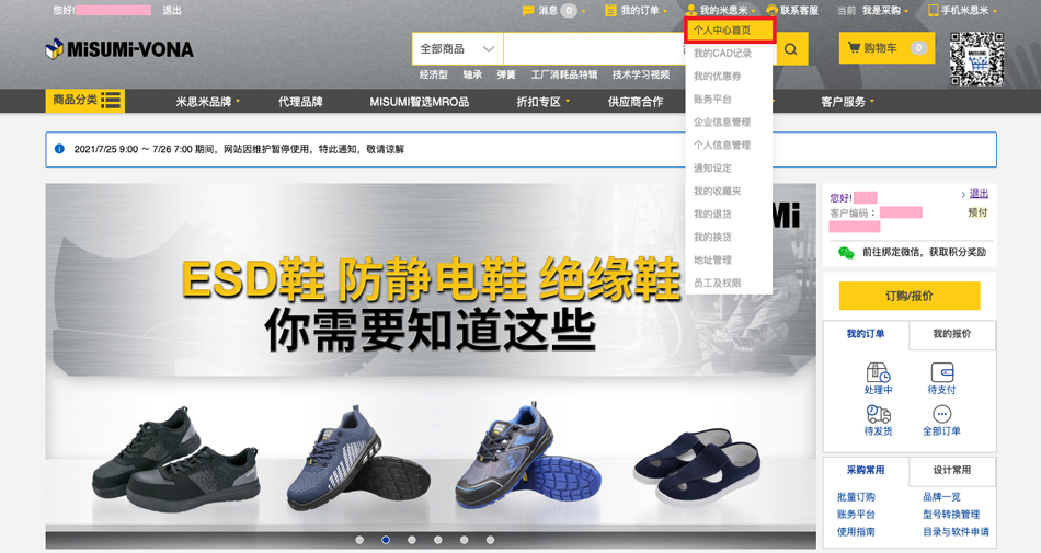 1.點擊米思米官網(wǎng)首頁【我的米思米】-【個人中心首頁】。