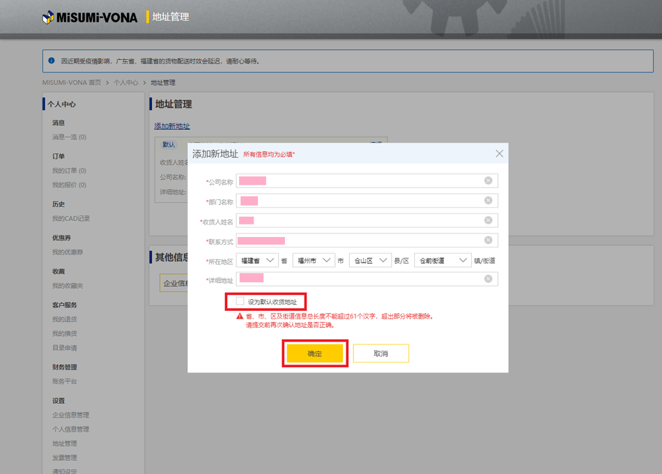 4.填寫信息,按需求選擇是否【設(shè)為默認(rèn)收貨地址】,點擊【確定】。