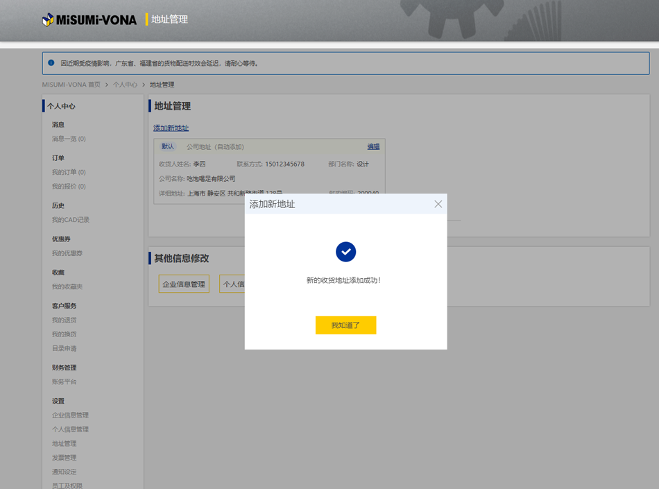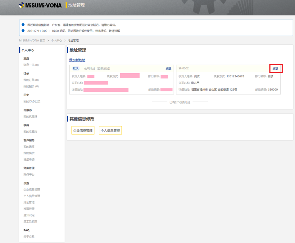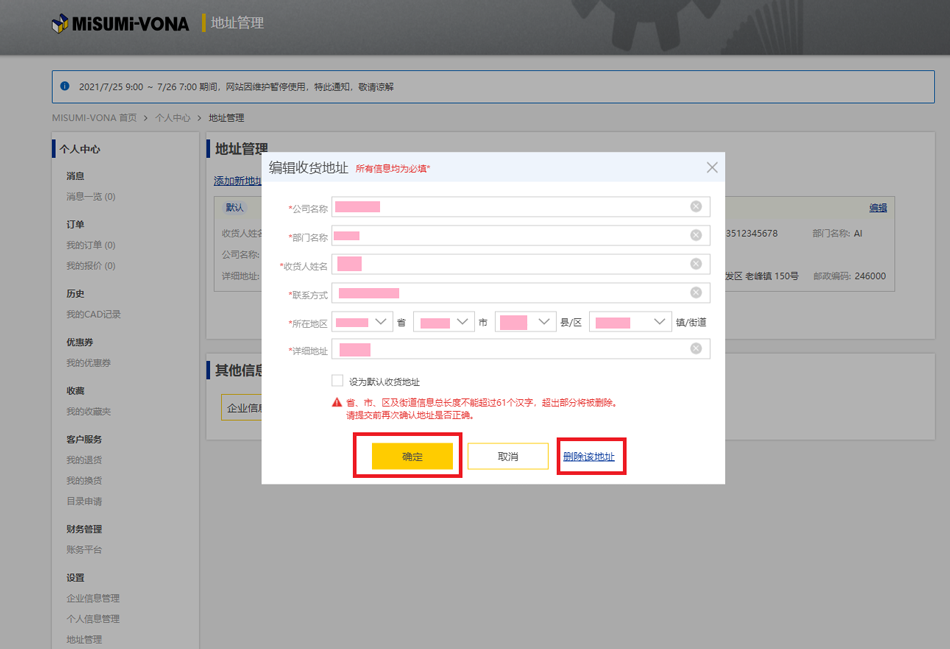 4.您可以根據(jù)需求選擇編輯或刪除地址。編輯地址后點擊【確定】即可保存。刪除地址點擊【刪除該地址】即可刪除。